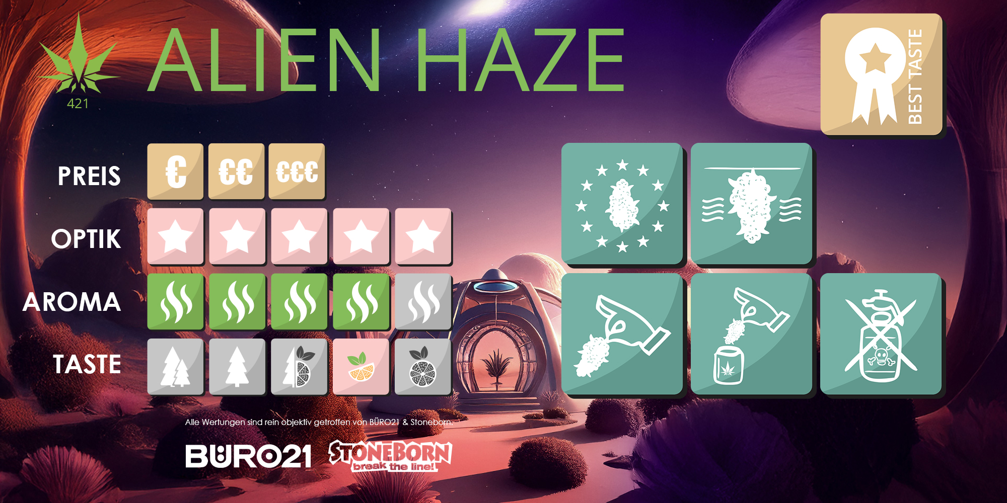 „Alien Haze“ verspricht, was der Name sagt: Das hier ist nicht von dieser Welt! Während andere auf dem Boden bleiben, steigst du mit unserer Blüte direkt den Stairway to Heaven hoch. Obwohl Schwerelosigkeit da oben herrscht, bringt diese Sorte eine genüssliche Schwere mit sich. Also heb mit „Alien Haze“ ab in die Entspannung.