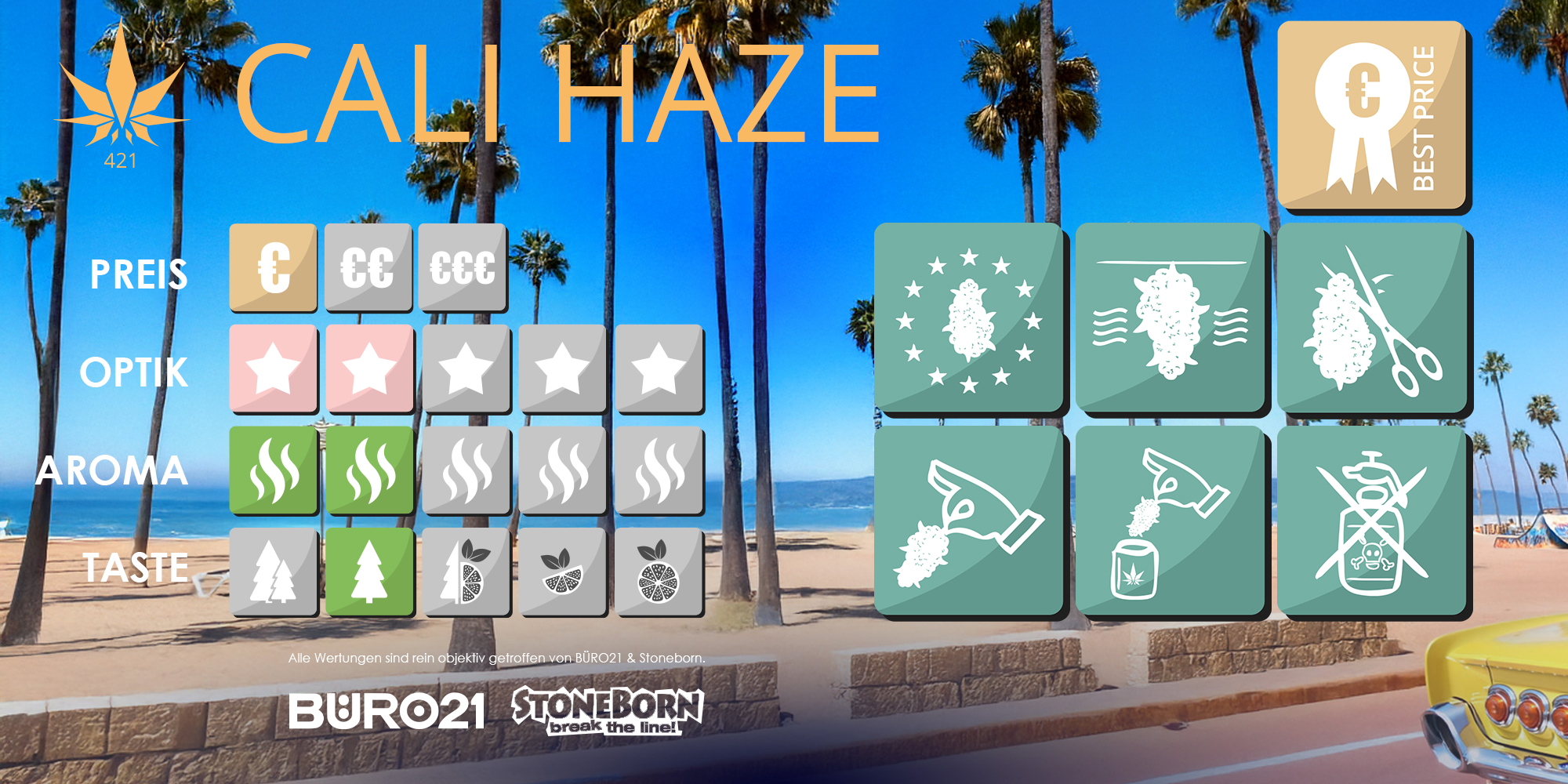 Neben dem super Preis überzeugt unser „Cali Haze“ mit einem sehr milden Aroma. Lass dich von der Sonne der californischen Küste verwöhnen und die Sorgen einfach mal im Meer baden. Ihr Duft ist genau so entspannt, wie du es bist, wenn du auf Rollschuhen unter den Palmen der Strandpromenade cruised.